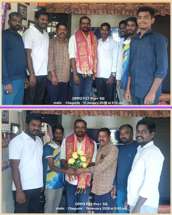 మెదక్ జిల్లా చేగుంట మండలం చేగుంట పట్టణానికి చెందిన స్టాలిన్ నర్సింలు మార్కెట్ కమిటీ డైరెక్టర్ గా ఎన్నికైనందుకు చేగుంట బోనాల ఆటో యూనియన్ సభ్యులు శాలువాతో సన్మానించడం జరిగింది . వారు మాట్లాడుతూ మా స్టాలిన్ నరసింహులు కి చేగుంట మార్కెట్ కమిటీ డైరెక్టర్ పోస్ట్ ఇచ్చినందుకు కాంగ్రెస్ ప్రభుత్వ పెద్దలకు మన దుబ్బాక ఇన్చార్జి శ్రీనివాస్ రెడ్డికి ధన్యవాదాలు మరి మాలో ఒకడిలా ఉంటాడు మా స్టాలిన్,ఇంక మంచి మంచి పోస్టులు రావాలి ప్రజలకు సేవ చేయాలి అని అన్నారు.ఈ కార్యక్రమంలో మేకల రవి కట్ట శ్రీనివాస్ గౌడ్ రాజు శ్రీకాంత్ సురేష్ పాల్గొనడం జరిగింది