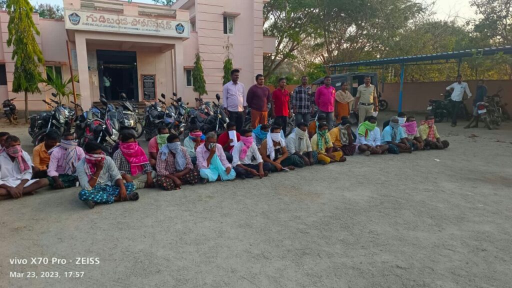 శ్రీ సత్య సాయి జిల్లా గుడిబండ పోలీస్ స్టేషన్ ఎస్ ఐ ముని ప్రతాప్ కు పేకాట జూదం గురించి రాబడిన ఖచ్చితమైన సమాచారం మేరకు, గుడిబండ పోలీస్ స్టేషన్ ఎస్ ఐ ముని ప్రతాప్ మరియు వారి సిబ్బందితో కలిసి ఈ రోజు అనగా 23.03.2023 తేదిన ఉదయం గుదిబండ గ్రామం, శ్రీ తుమ్మల మారెమ్మ గుడి సమీపమున బహిరoగ స్థలములో కొంతమంది కూర్చొని, డబ్బులను ఫణంగా పెట్టి “లోపల-బయట’ అను గ్యాంబ్లింగ్ అను జూదమును ఆడుతూ ఉండగా వారిని సిబ్బంది సహాయంతో రైడ్ చేసి గుడిబండ మండలానికి చెందిన మొత్తం 29 మందిని అదుపులోకి తీసుకుని, వారి నుండి మొత్తం 78,200/- (డెబ్బై ఎనిమిదివేల రెండు వందల రూపాయలు) నగదు, లోపల-బయట ఆడు 52 పేక ముక్కలు రెండు ప్యాకులను, మరియు మొత్తం 27 ద్విచక్ర వాహనములు స్వాధీనం చేసుకొని సీజ్ చేసి వీరి అందరిపై కేసు నమోదు చేసినట్లు ఎస్ ఐ ముని ప్రతాప్ తెలిపారు. ఈ మెరుపుదాడిలో ఏఎస్ఐ చంద్ర శేఖర్, కానిస్టేబుల్స్ రఫీ, చంద్ర నాయక్ , వెంకటేష్, లక్ష్మి కుమార్ , తదితరులు పాల్గొన్నారు .