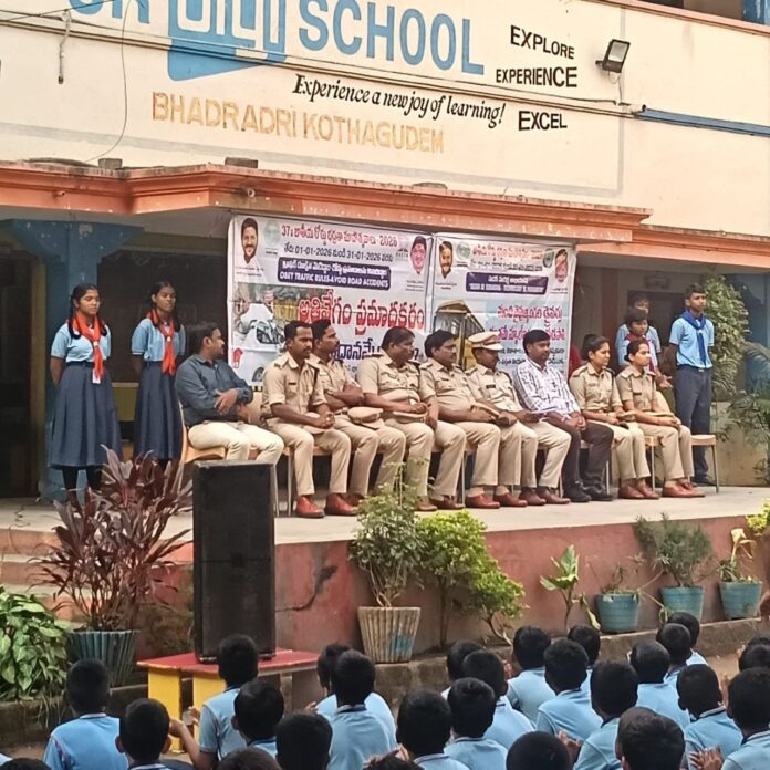 రోడ్డు భద్రత వారోత్సవాల్లో భాగంగా భద్రాద్రి కొత్తగూడెం జిల్లా రవాణా శాఖ ఆధ్వర్యంలో స్థానిక రాంనగర్లోని ఎస్ఆర్ డీజీ పాఠశాలలో సడక్ సంరక్షణ అభియాన్ కార్యక్రమం నిర్వహించారు. ఈ కార్యక్రమానికి జిల్లా ఆర్టీఓ భూషిత్ రెడ్డి ముఖ్యఅతిథిగా హాజరై విద్యార్థులకు రోడ్డు భద్రతపై అవగాహన కల్పించారు.