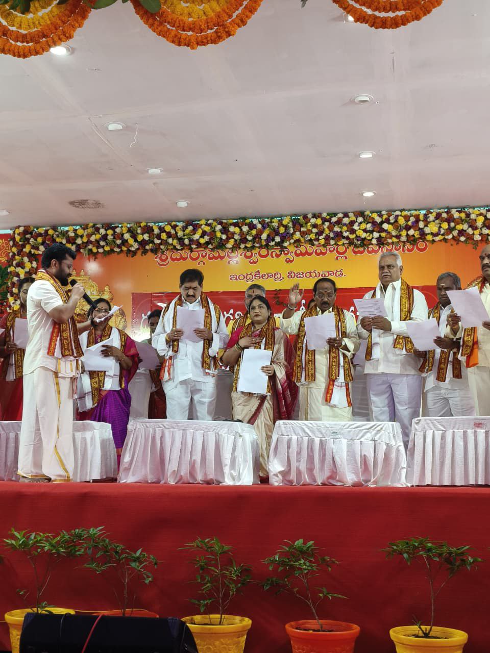 *_ప్రమాణ స్వీకారం అనంతరం ఆలయ అర్చకులు నూతనంగా ఏర్పడిన కమిటీ సభ్యులతో కలసి చైర్మన్ ని వేద ఆశీర్వచనంతో ఆశీర్వదించారు. తదనంతరం ఆలయ మర్యాదలతో అమ్మవారి దర్శనం చేసుకొని తీర్థప్రసాదాలు స్వీకరించారు._*